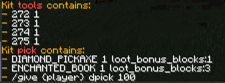 Alternatively, if pastebin-createkit is set to true, creates a kit based on your inventory and pastes an online link with the lines to add to your kits.yml by hand.