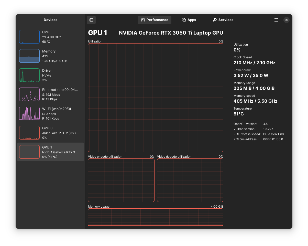 - Monitor overall GPU usage, video encoder and decoder usage, memory usage and power consumption, powered by the popular NVTOP project