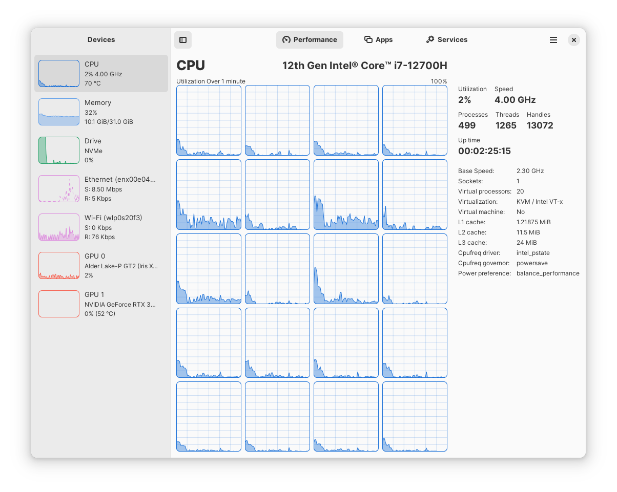 - See system process, thread, and handle count, uptime, clock speed (base and current), cache sizes