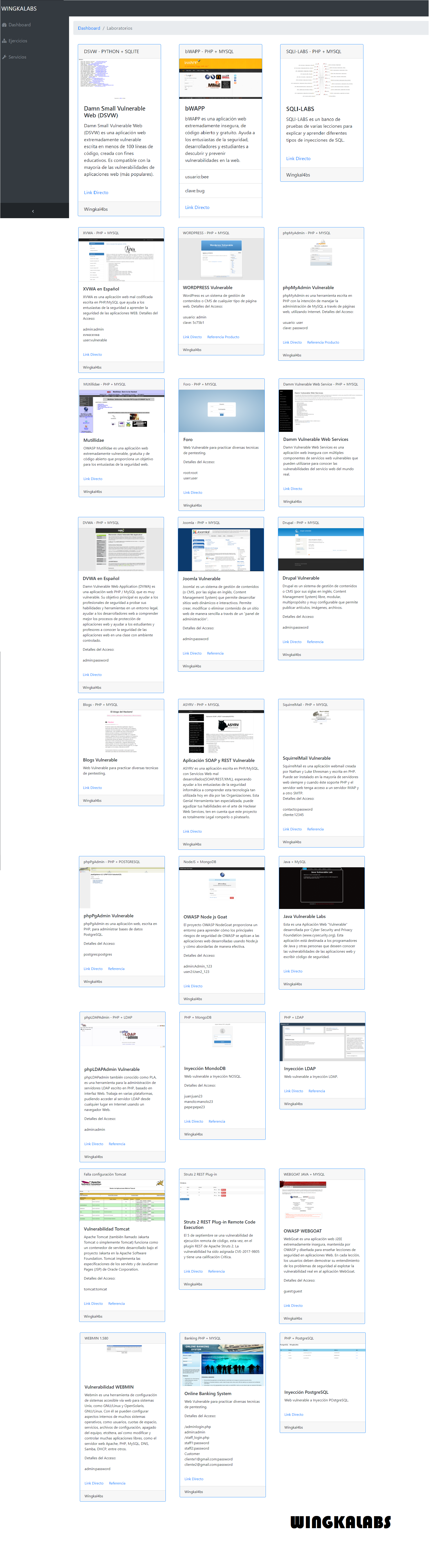 Cabe destacar que WingkaLabs tiene más de 27 Laboratorios de educación a Pentester, dentro de cada uno de ellos existen muchas vulnerabilidades por descubrir y explotar, que en total suman más de 400 vulnerabilidades para aprender.