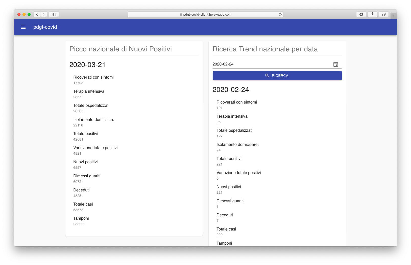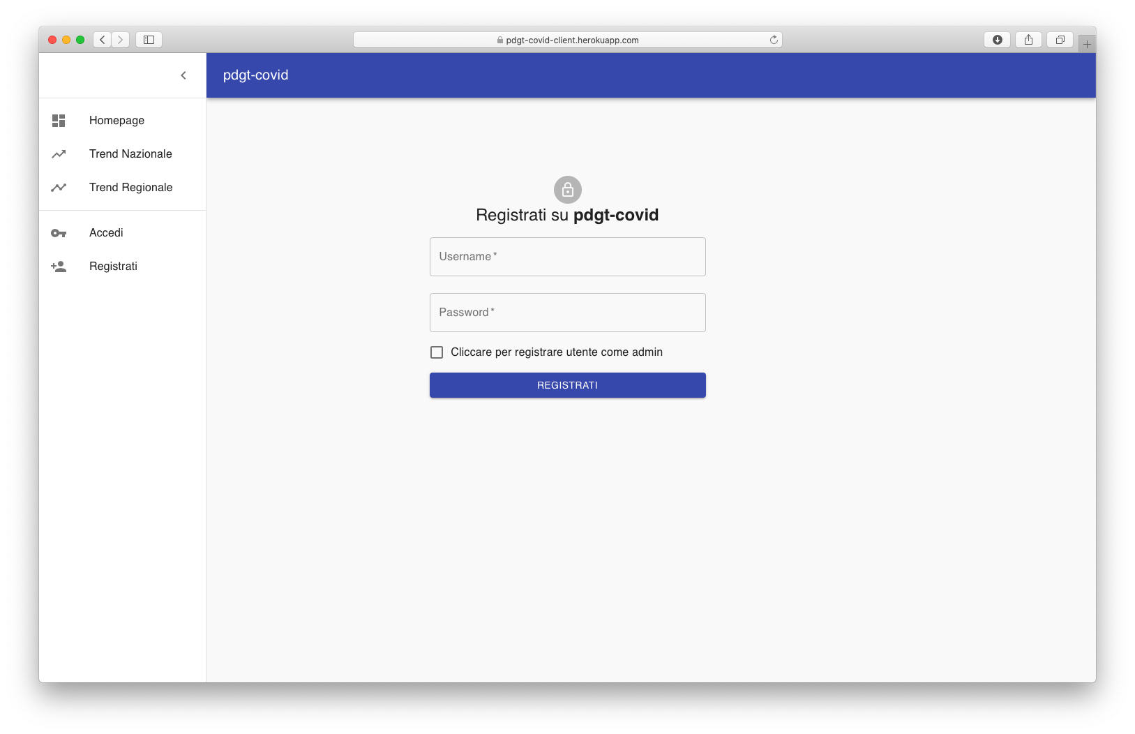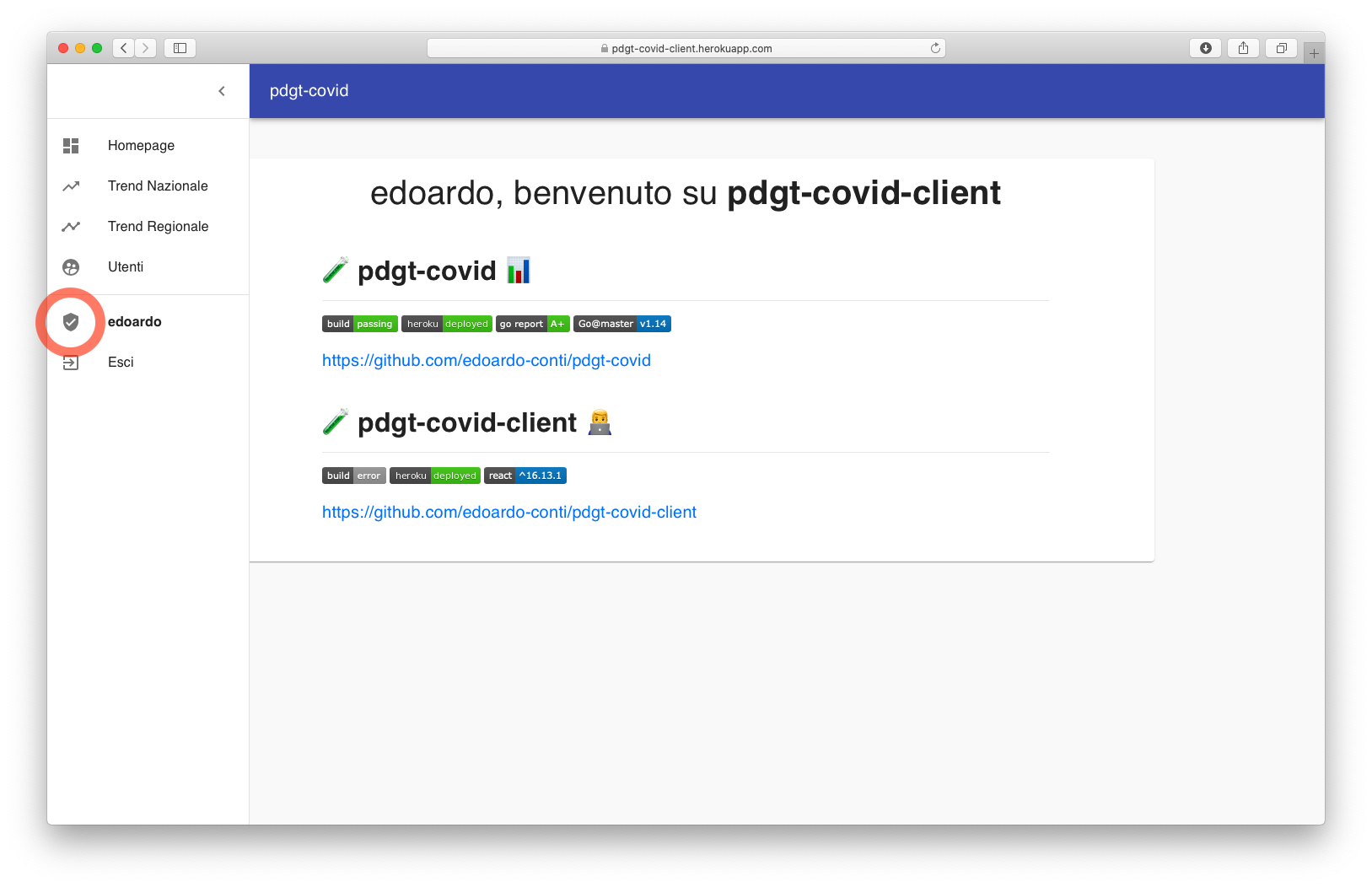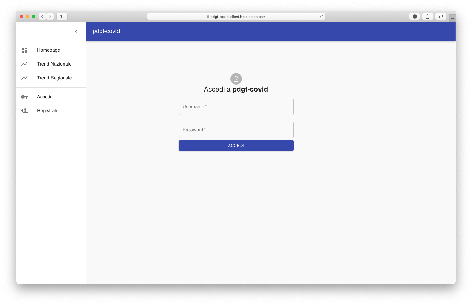 L'applicativo è erogato secondo le stesse modalità CI/CD illustrate nella sezione appena sopra, ergo è accessibile al seguente indirizzo: https://pdgt-covid-client.herokuapp.com