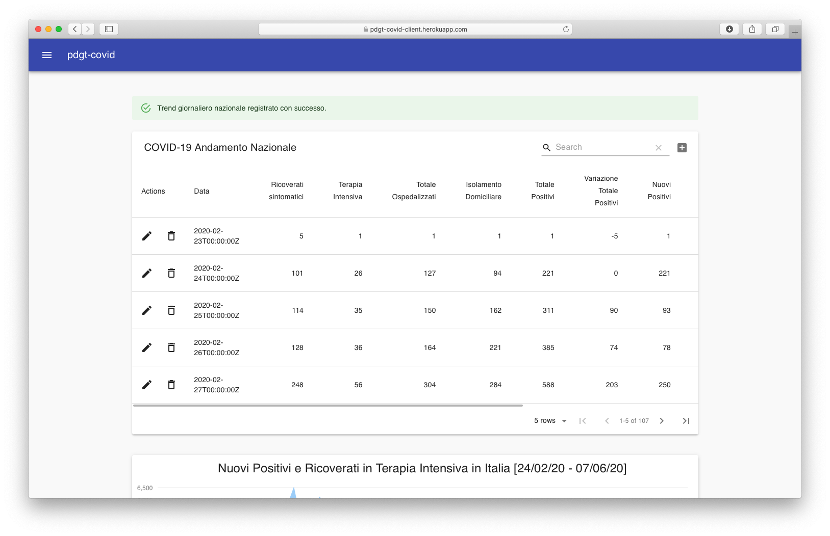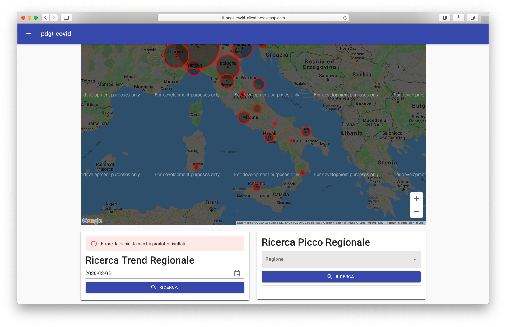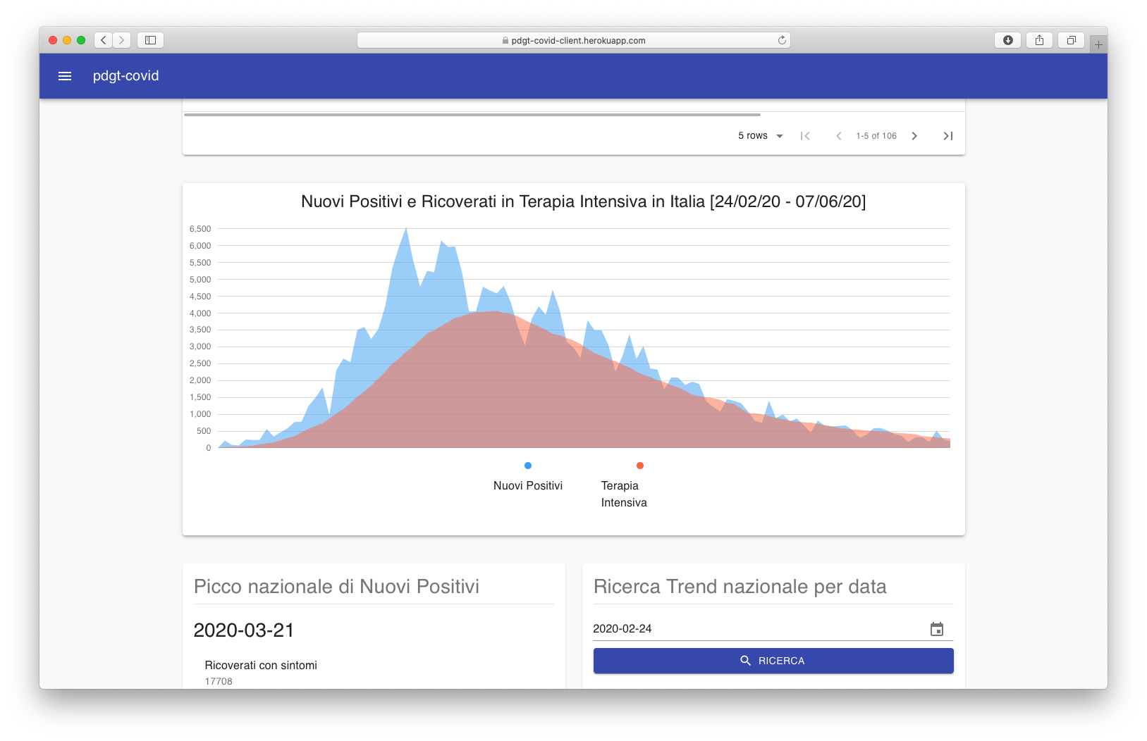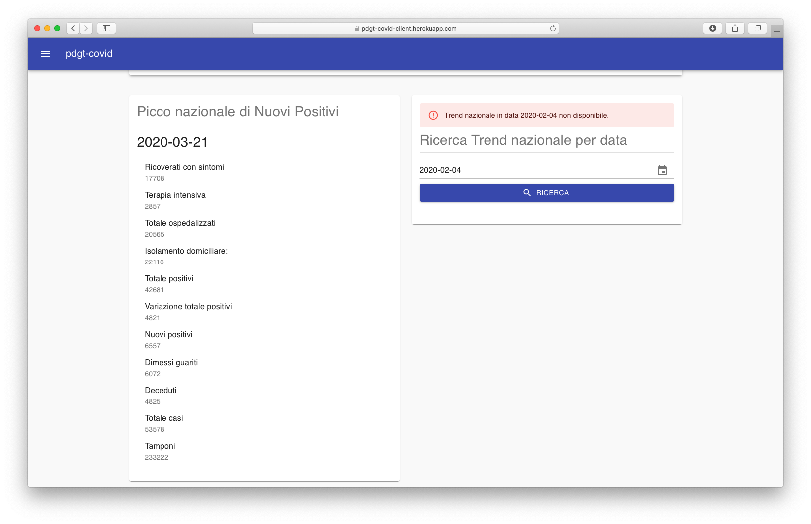L'applicativo è erogato secondo le stesse modalità CI/CD illustrate nella sezione appena sopra, ergo è accessibile al seguente indirizzo: https://pdgt-covid-client.herokuapp.com
