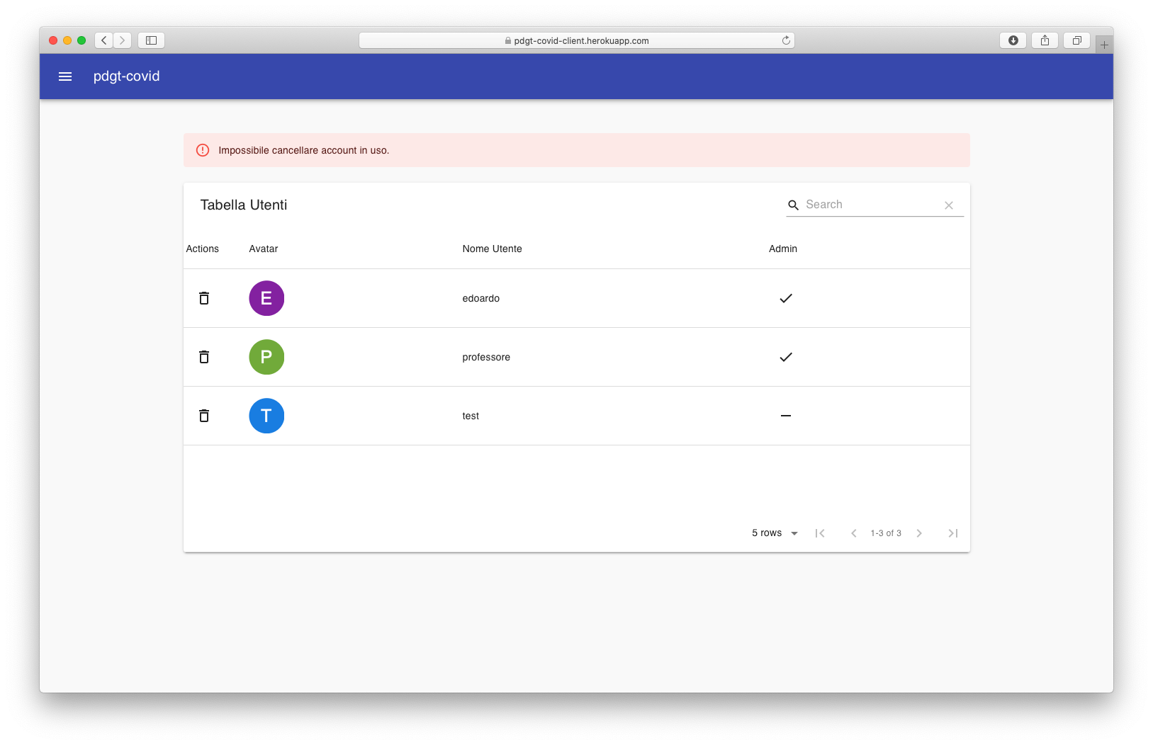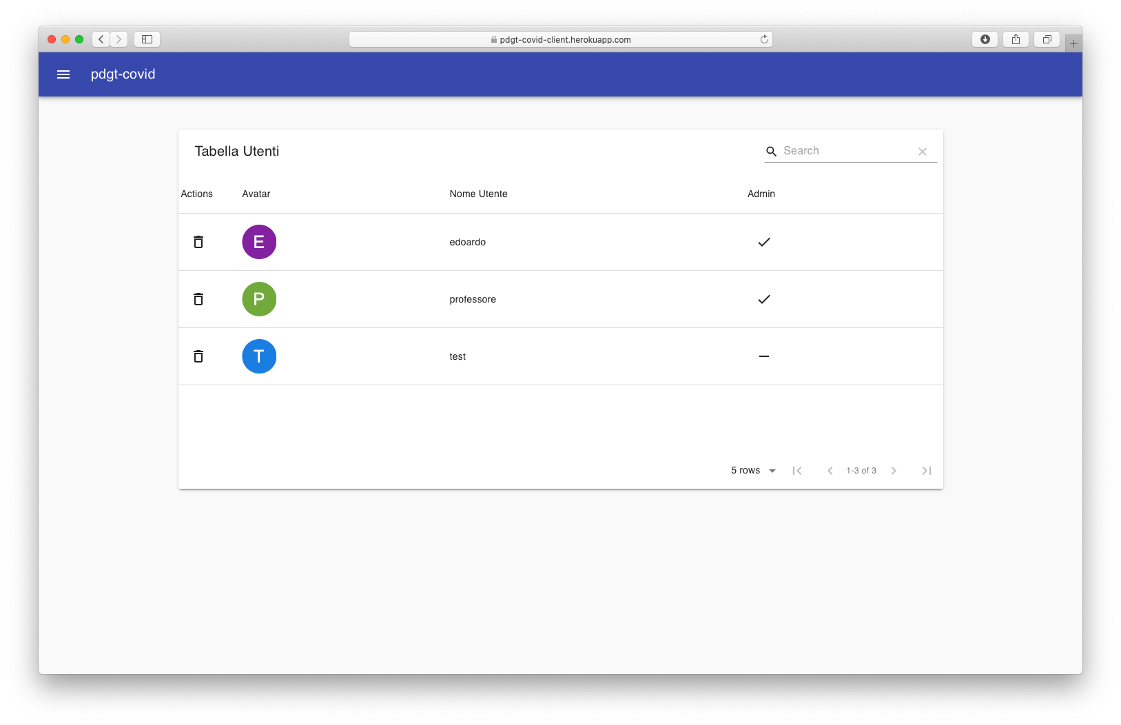 Il principale componente sfruttato per mostrare e manipolare i dati a disposizione è material-table, una semplice ma molto potente data-table per React basata su Material-UI Table.