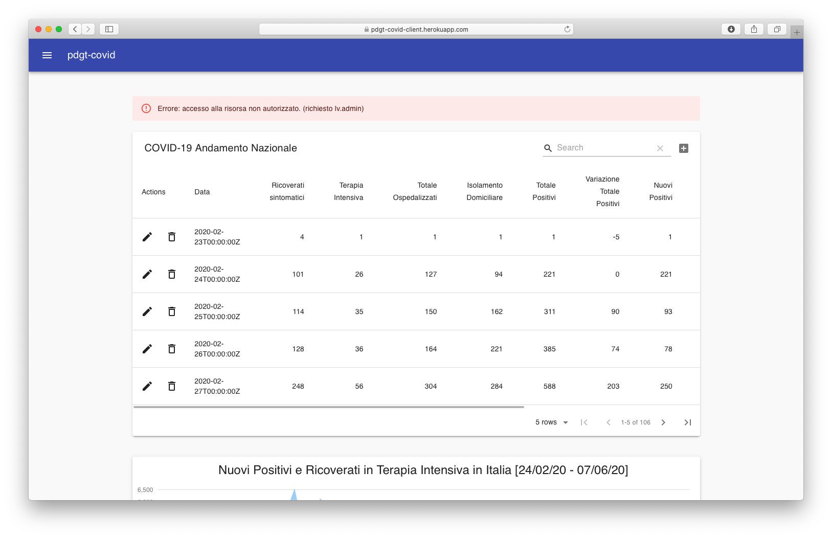 $ PGPASSWORD=<db_password> psql -h <host> -U <username> <database> -c "\copy nazione (data,stato,ricoverati_con_sintomi,terapia_intensiva,totale_ospedalizzati,isolamento_domiciliare,totale_positivi,variazione_totale_positivi,nuovi_positivi,dimessi_guariti,deceduti,totale_casi,tamponi,casi_testati,note_it,note_en) FROM '<path_to_dpc-covid19-ita-andamento-nazionale.csv>' CSV HEADER DELIMITER ','"La sicurezza sulla modifica dei dati archiviati è gestita su due layer: autenticazione ed autorizzazione. Il sistema è stato pensato ponendo dei limiti di lettura e scrittura su utenti non autenticati. Per quanto riguarda quindi l'autenticazione: un utente registrato gode di privilegi di lettura superiori rispetto ad un visitatore e vanta la possibilità di effettuare richieste HTTP POST (all'infuori del signup e signin). L'autorizzazione si riferisce al role dell'utente, se Admin, possiede tutti i privilegi di lettura e scrittura. Per tanto oltre a quanto possibile ad un Utente, un Admin può effettuare richieste HTTP PATCH e DELETE. Di seguito è riportata una tabella che riassume i permessi delle API: