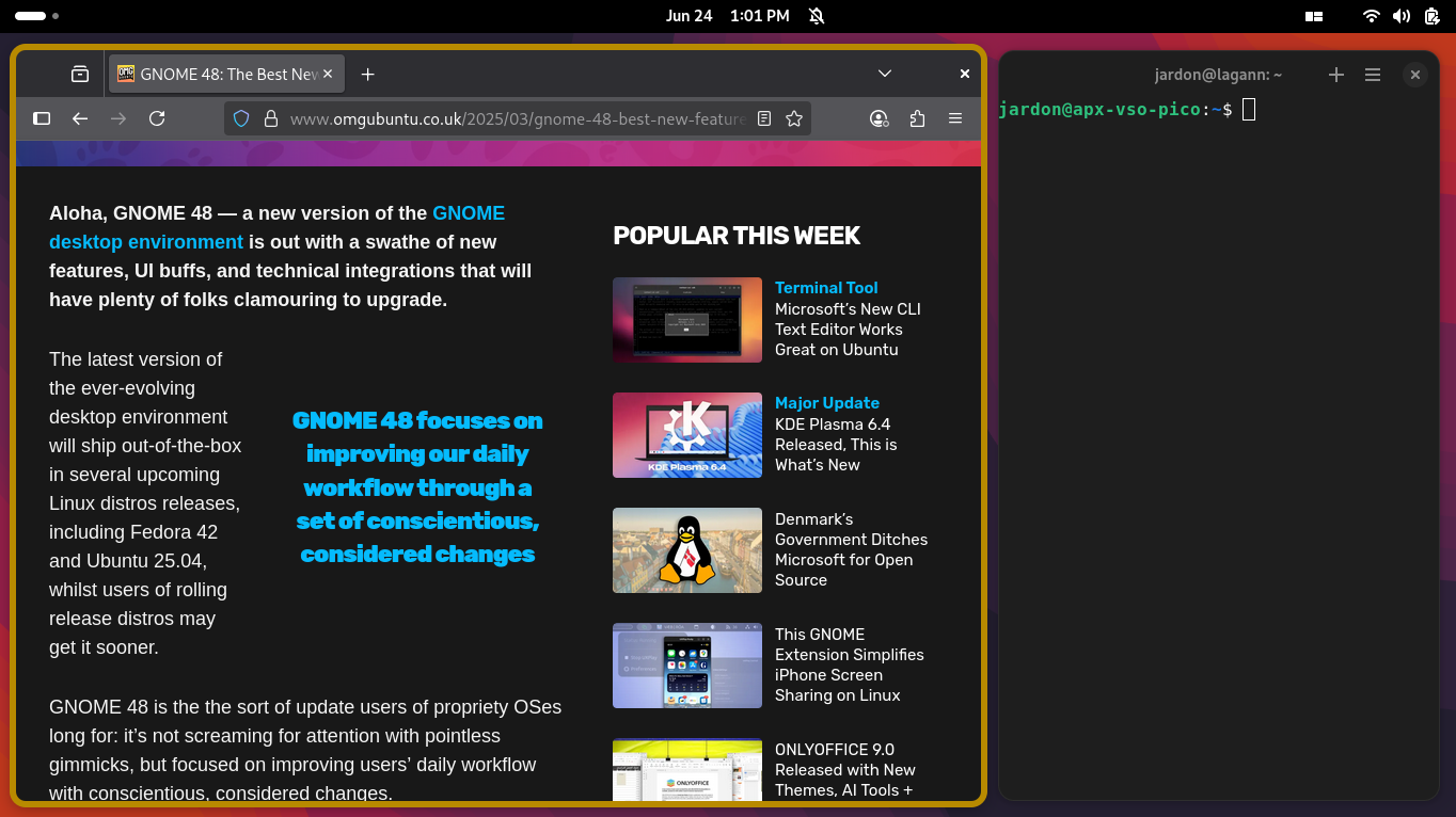 Windows with server-side decorations may have their title bars completely hidden, resulting in additional screen real estate for your applications, and a visually cleaner environment. This feature can be toggled in the extension's popup menu. Windows can be moved with the mouse by holding Super when clicking and dragging a window to another location, or using the keyboard shortcuts native to gnome-mosaic. Windows may be closed by pressing Super + Q, and maximized with Super + M.