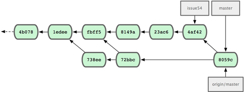 很重要的一点是你得注意这些提交的顺序与你通常通过log命令看到的是相反的。如果你运行log,你会看到下面这样的结果: