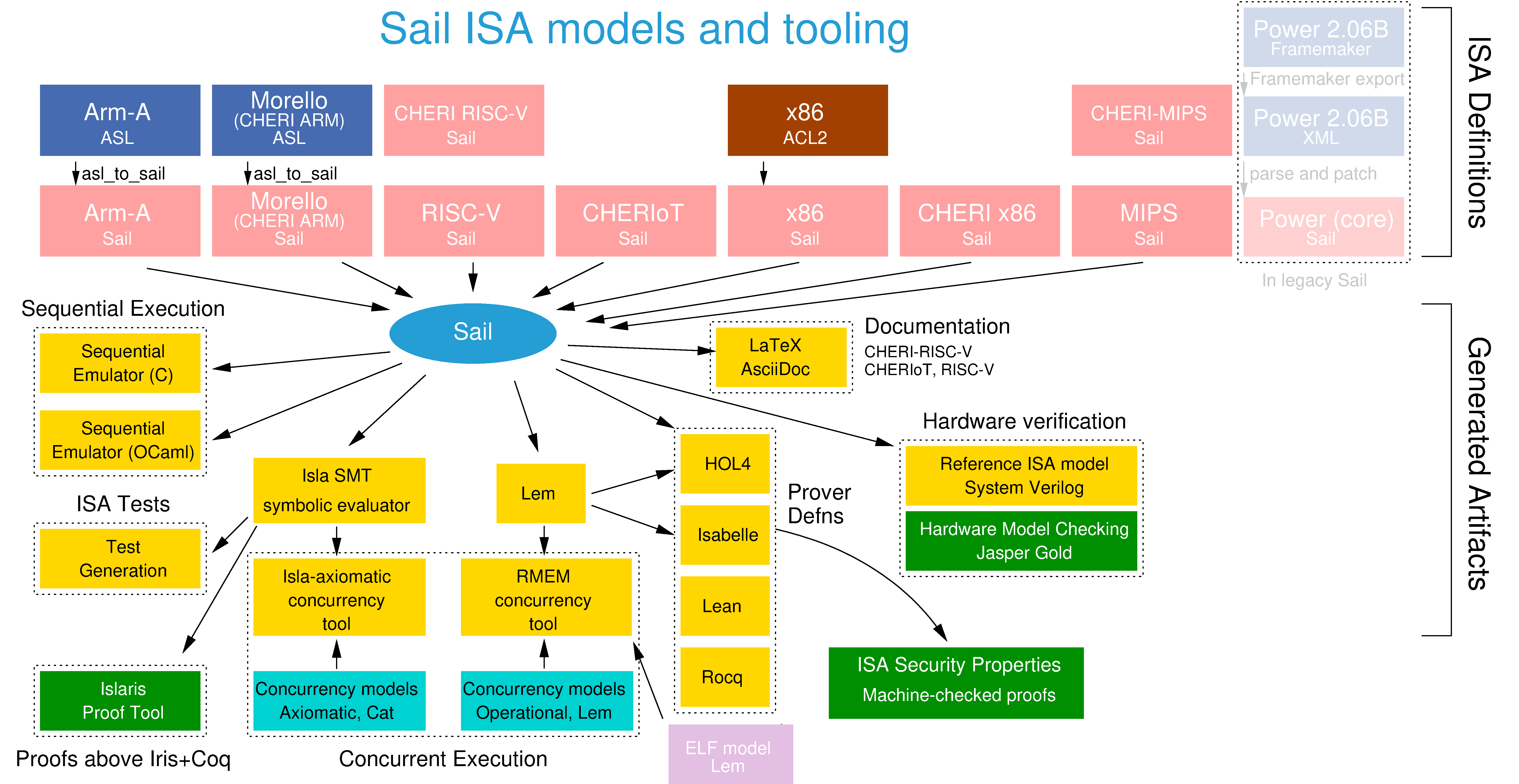 Given a Sail specification, the tool can type-check it, generate documentation snippets (in LaTeX or AsciiDoc), generate executable emulators, show specification coverage, generate versions of the ISA for relaxed memory model tools, support automated instruction-sequence test generation, generate theorem-prover definitions for interactive proof (in Isabelle, Rocq, and Lean), support proof about binary code (in Islaris), and (in progress) generate a reference ISA model in SystemVerilog that can be used for formal hardware verification.