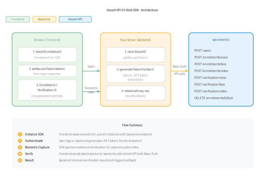 This repository contains an example web demonstration of VoiceIt's API 3.0 in the browser with a PHP, NodeJS, or Go backend. See Incorporating the SDK for instructions on integrating the SDK into your own project.